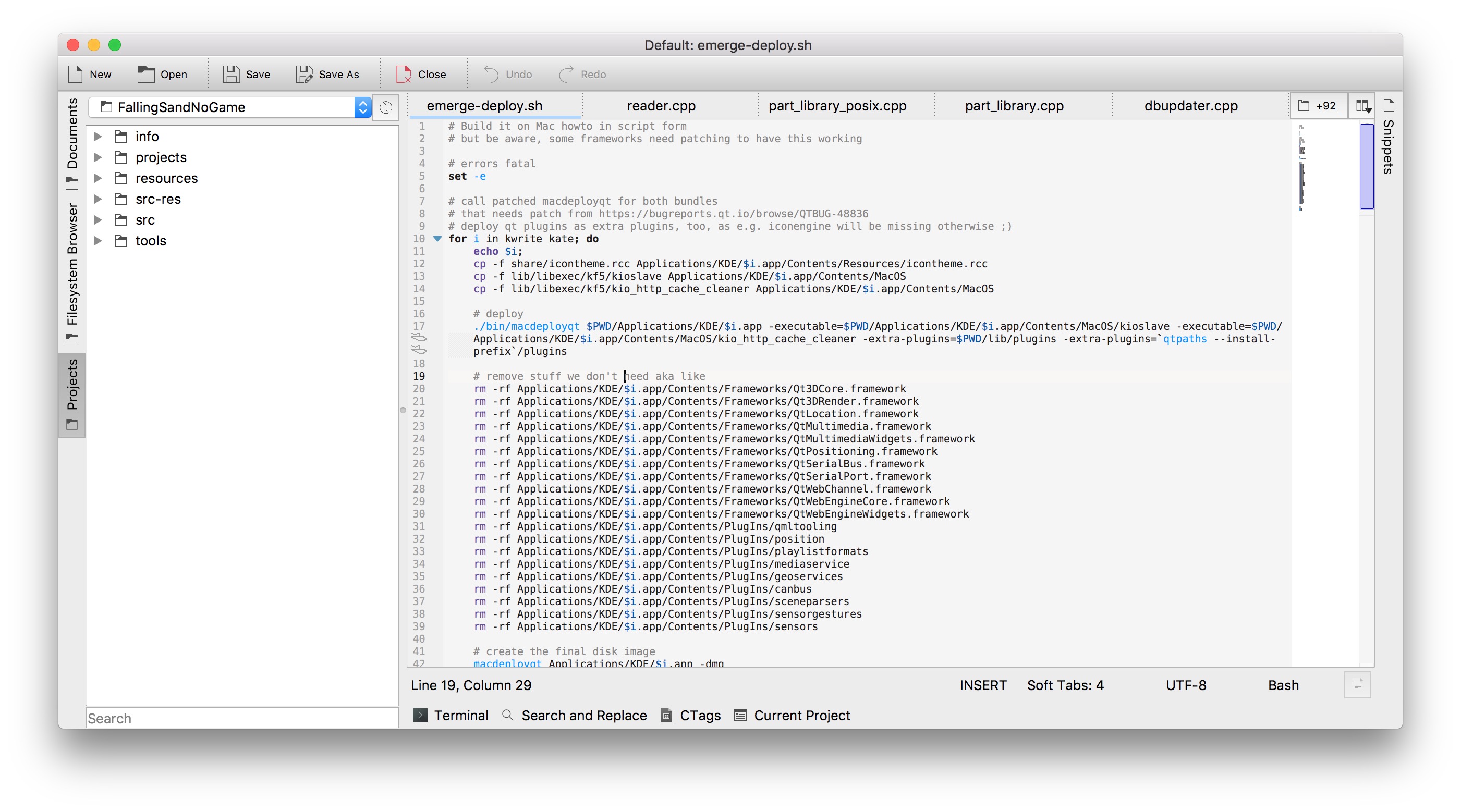 If you, like me, are a user of Kate editor, might be feeling a bit disappointed of quite old build of Kate editor available on official KDE page. Fortunately, build system for KDE (Craft) made compiling Kate relatively painless process (yet, getting working final bundle still require some hacking) so here are the .dmg for Kate and Kwrite (ver. 18.04):